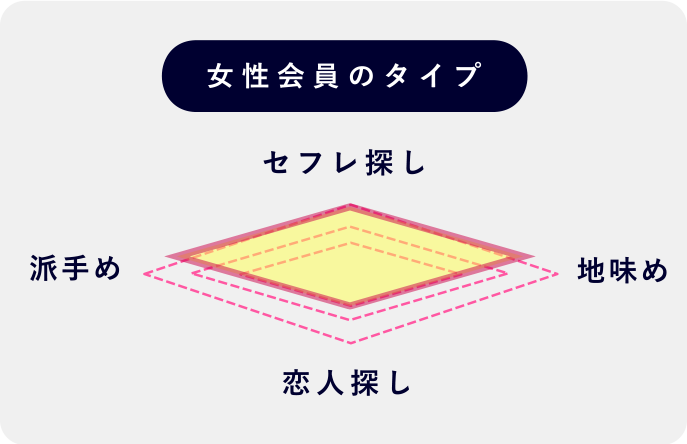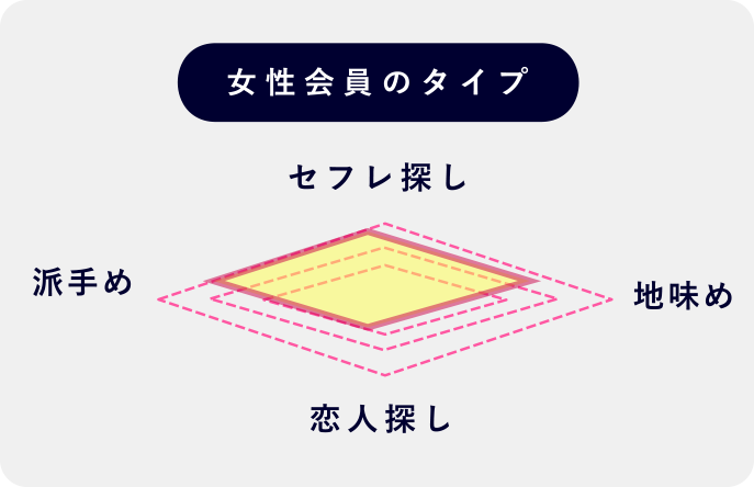 女性会員は派手めな方や明るい方が多く、地味なタイプは少ない傾向です。真剣な恋人探しや婚活目的のユーザーは少ないので、セフレ探しや遊び目的で利用しましょう。