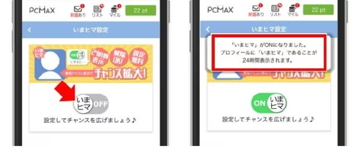 注意点としては「いまヒマアイコン」をONにしている女性の中に「今から〇〇駅で…」や「今すぐ会いたい」など頻繁に書いている相手は業者の可能性が高いです。 「いまヒマアイコン」をオンにしていて、メッセージを楽しみたい相手を見つけましょう。